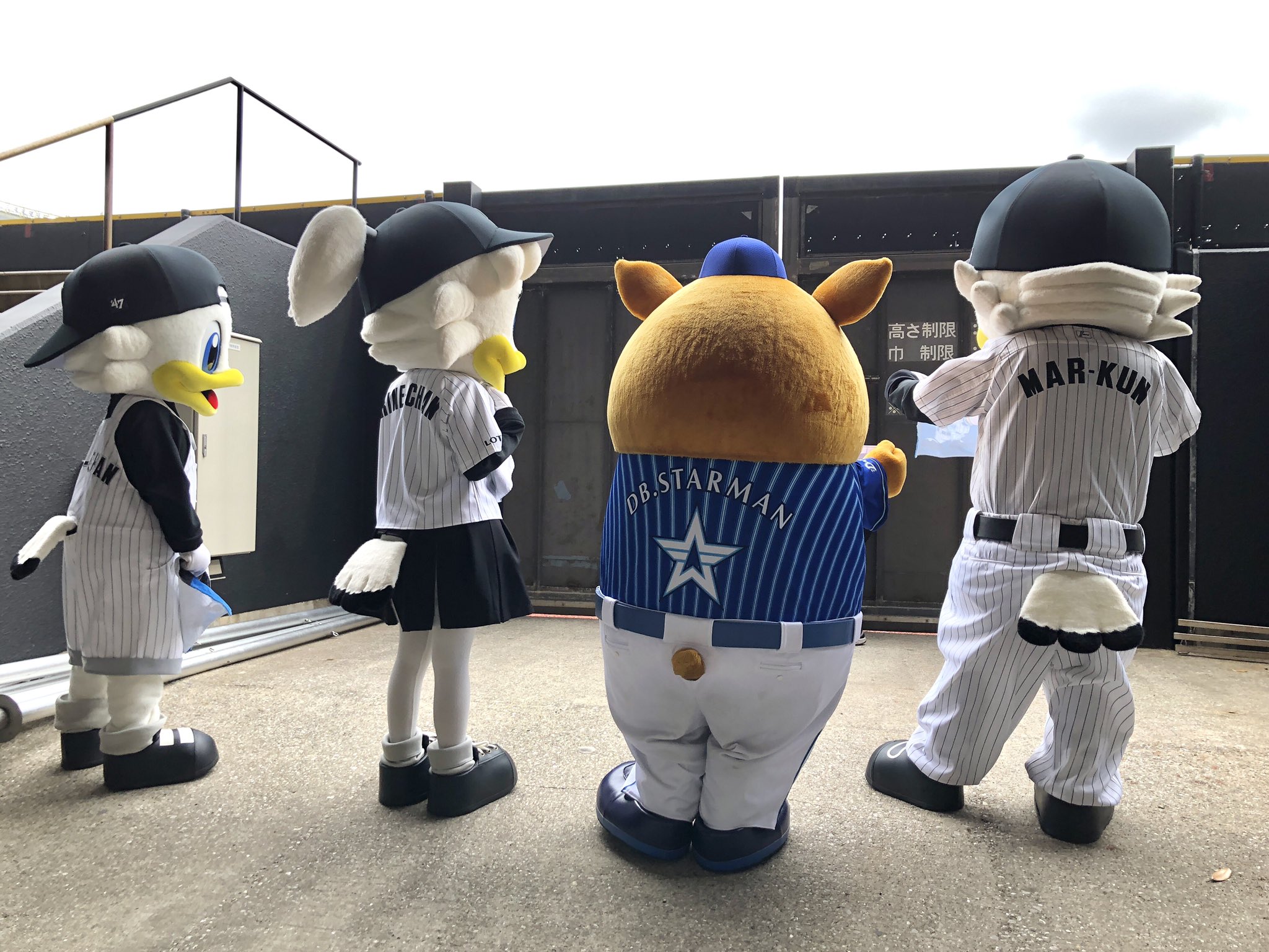 ゲリラ豪雨で試合開始が遅れ、マー君達も避難する中、健気にファンサービスを続けるレインコート姿のDB.スターマン。 #baystars #chibalotte pic.twitter.com/jmWnRnY5OZ