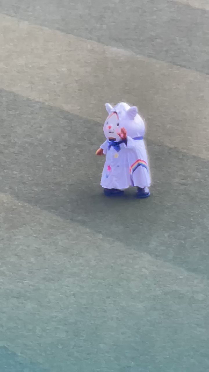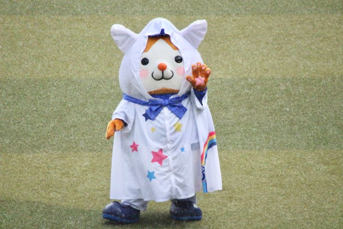 ゲリラ豪雨で試合開始が遅れ、マー君達も避難する中、健気にファンサービスを続けるレインコート姿のDB.スターマン。 #baystars #chibalotte pic.twitter.com/jmWnRnY5OZ