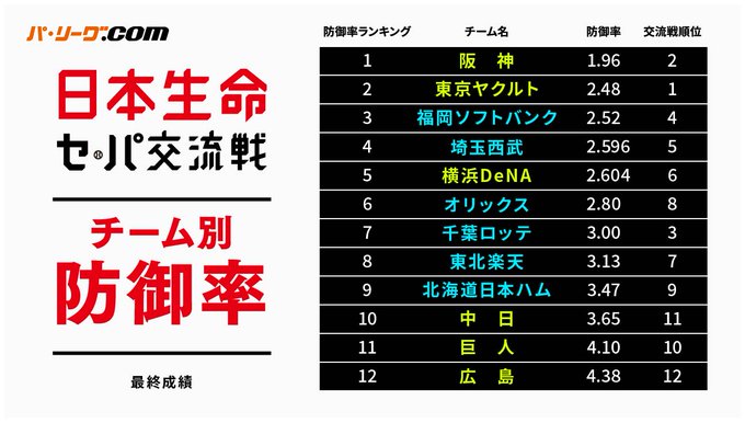 ✅チーム別防御率最終成績