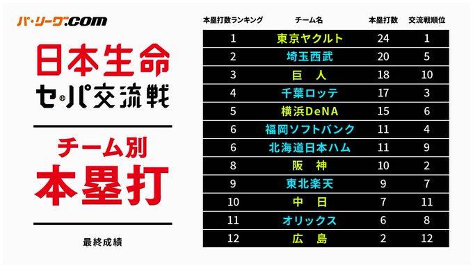 ✅チーム別本塁打最終成績