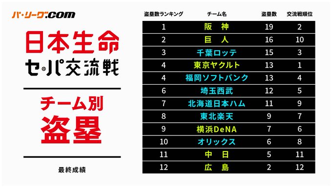 ✅チーム別盗塁数最終成績