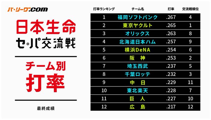 ✅チーム別打率最終成績