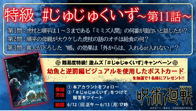 本日17時よりMBS/TBS系全国28局ネットにて放送される第11話「固陋蠢愚」を観ないと分からない難易度特級のクイズにハッシュタグ #じゅじゅくいず を付けてチャレンジ!
