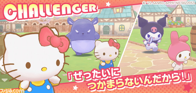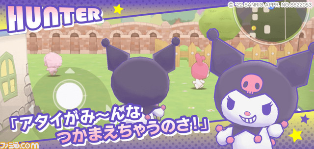 #サンリオ の キャラクターたちによるスマホ向け非対称型対戦ゲームで、基本プレイ無料。ほのぼの可愛らしい世界観で、追いかける側「ハンター」2名、逃げる側「チャレンジャー」6名でプレイ。