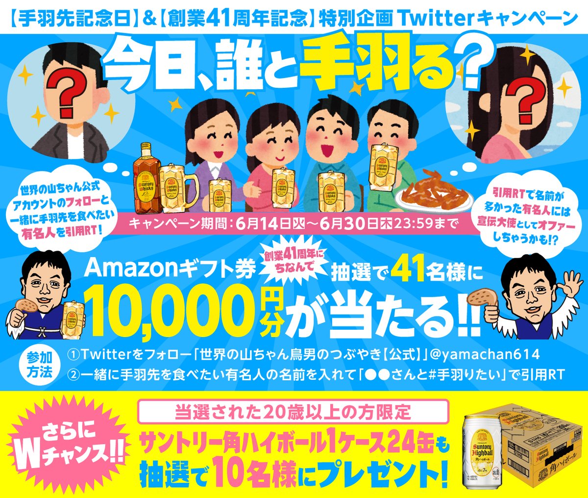 山ちゃん公式アカウントをフォローの上、一緒に手羽先を食べたい有名人の名前と一緒に引用RT!