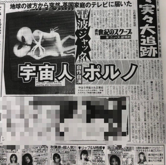 かつて東スポでは「電波ジャック宇宙人ポルノ」との記事で、家庭用テレビがインベーダーのAVに侵略されことを報じました。 pic.twitter.com/DF4cJwFzSg