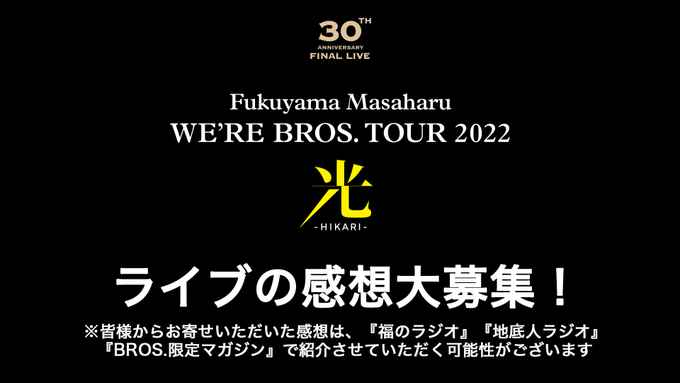 今日は福山雅治さんのライブに行ってきました!たくさんライブ観てきましたが、一番美しい舞台芸術がそこにはありました。福山さんの想いが心に響いた最高のライブ。満員の観客の中、リアルのライブの力というのを感じました。自分もこんなエンターテイメントを届ける人になりたい。 #BROS1991