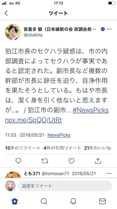 狛江市長のセクハラを糾弾していた音喜多駿氏が、猪瀬氏のセクハラを「称賛」。 twitter.com/otokita/status… pic.twitter.com/7e6IIwXvrg