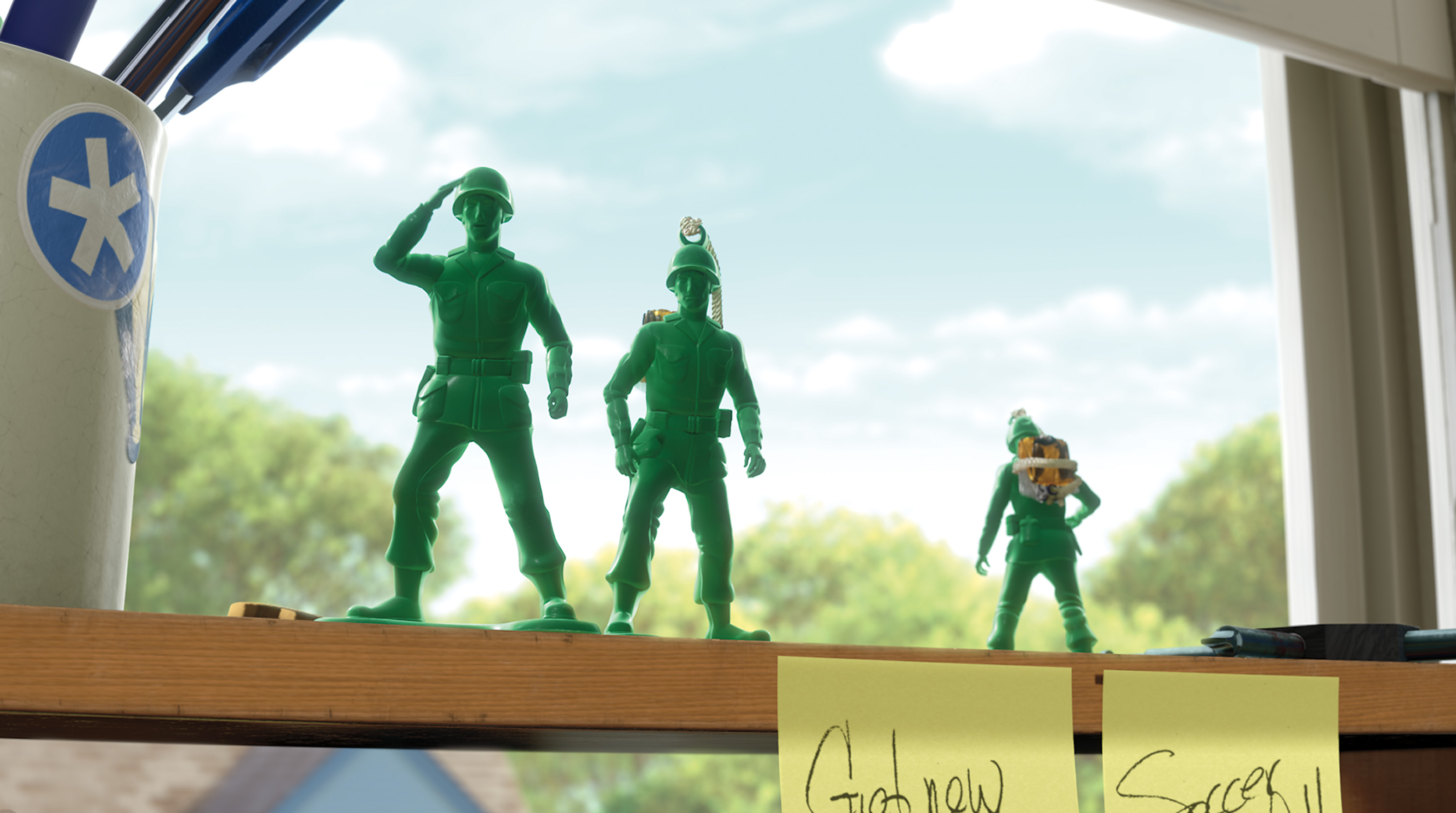 前作から10年余り。アンディに遊んでもらった年月の経過を、バズのヘルメットのひっかき傷や、スリンキーの耳が擦り切れていることなどで表現しています。