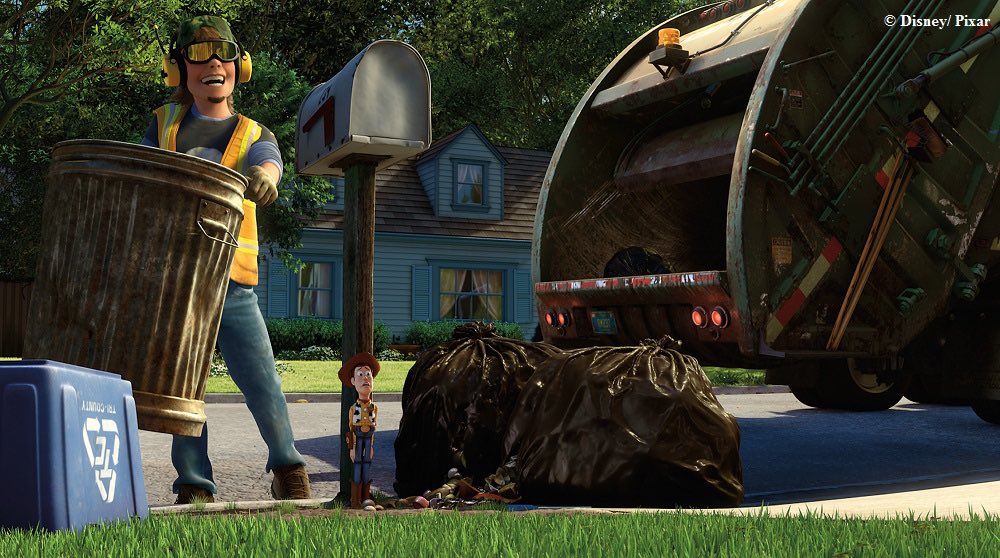こちらの💀ドクロマークのシャツを着たごみ清掃員、実は1作目でおもちゃをぞんざいにしていた隣家のシド・フィリップスなんだそう。アンディもシドもすっかりかわりましたね