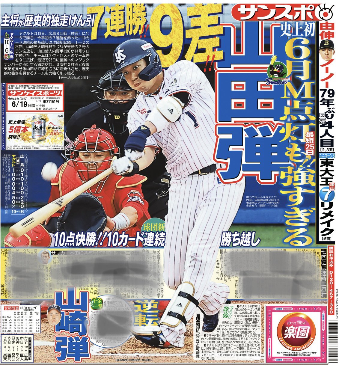 おはようございます☀本日の #サンスポ(東最終版、電子版)1面は、#山田哲人 選手!主将が徐々に復調気配!7連勝で10カード連続勝ち越しを決め、2位・巨人とのゲーム差を「9」に広げ、史上初めて6月にもマジック点灯する可能性が出てきました。