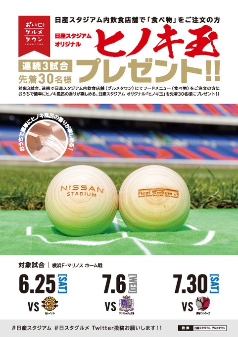 スタジアム場内飲食売店では、6月25日からの横浜F・マリノス戦3試合を対象として、フードをお買い上げのお客様各店舗先着30名様に、日産スタジアムのロゴ入り「ヒノキ玉」をプレゼントします。