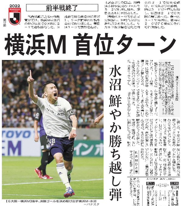 J1は前半戦を終え、3連勝の #fmarinos が首位で折り返しました。もちろん今朝のトップ記事。決勝点を挙げた #水沼宏太 選手のカラー写真入りです🇫🇷 pic.twitter.com/MyeKMfYNJ6