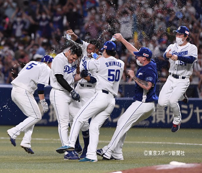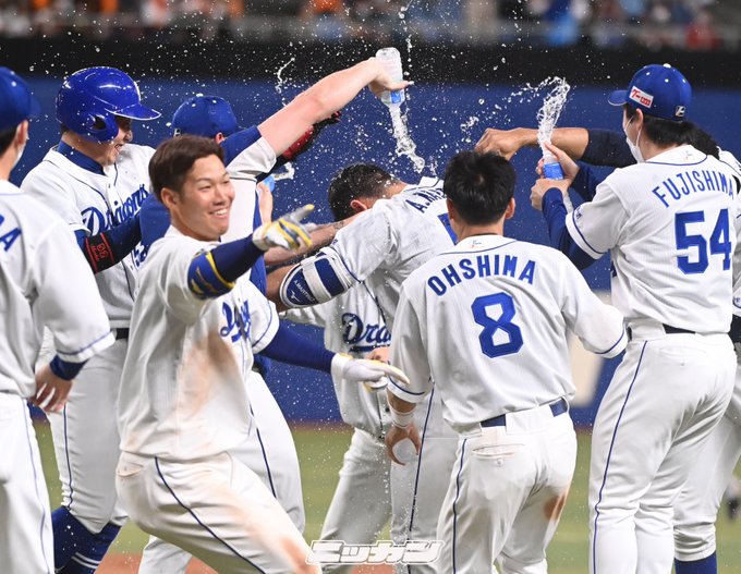 中日、サヨナラ勝ちの瞬間!!! アリエル・マルティネスが物凄い量の水をぶっかけられる!!! - ドラ要素@のもとけ dnomotoke.com/archives/20220… #dragons #中日ドラゴンズ