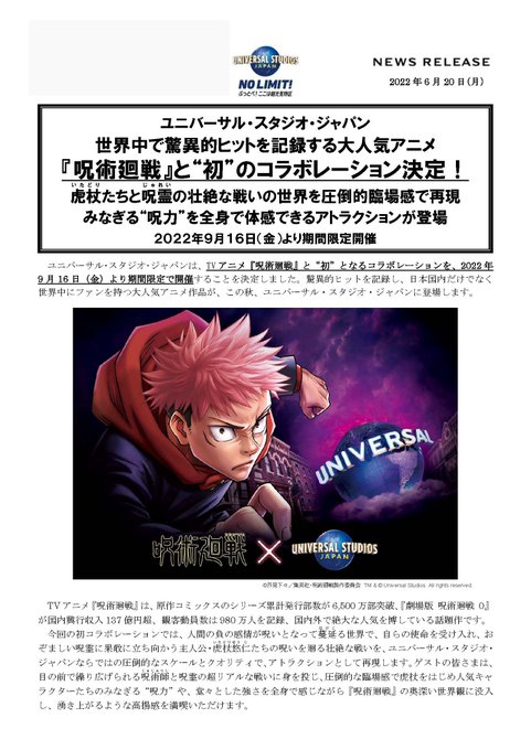速報) ユニバーサル・スタジオ・ジャパン『呪術廻戦』と“初”のコラボレーション決定!2022年9月16日(金)より期間限定開催( #USJ 公式プレスリリース)