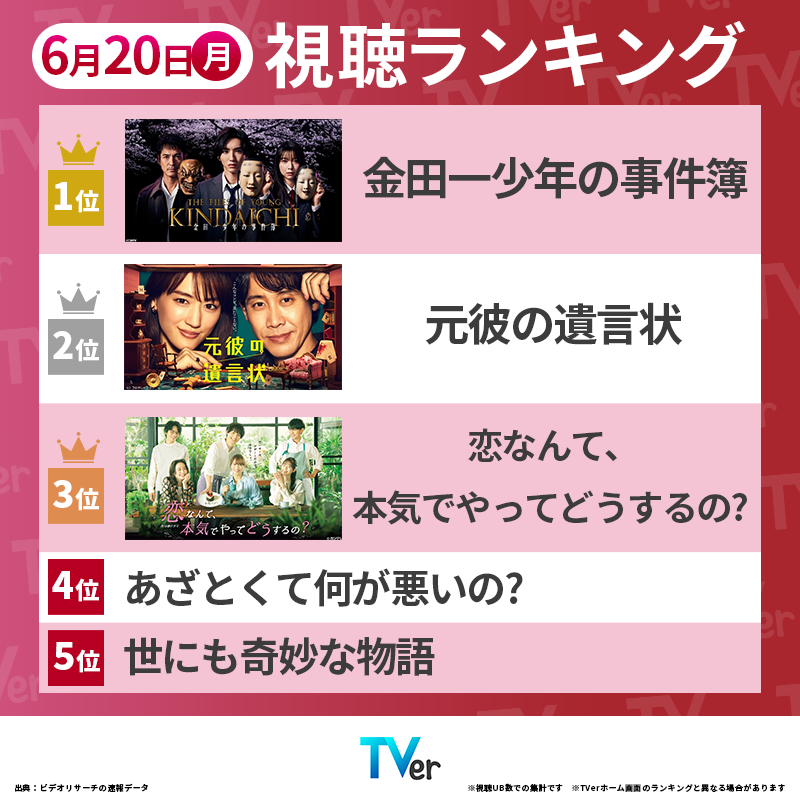 👑きのう 6/20(月)の #TVerデイリーランキング 👑