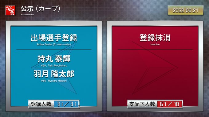 【カープ関連公示】[登録]持丸泰輝、羽月隆太郎(2022年6月21日)