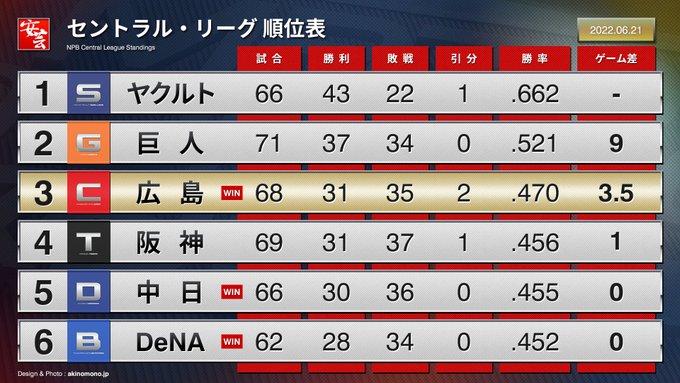 【順位表】カープ、連敗を「5」でストップ(2022年6月21日)