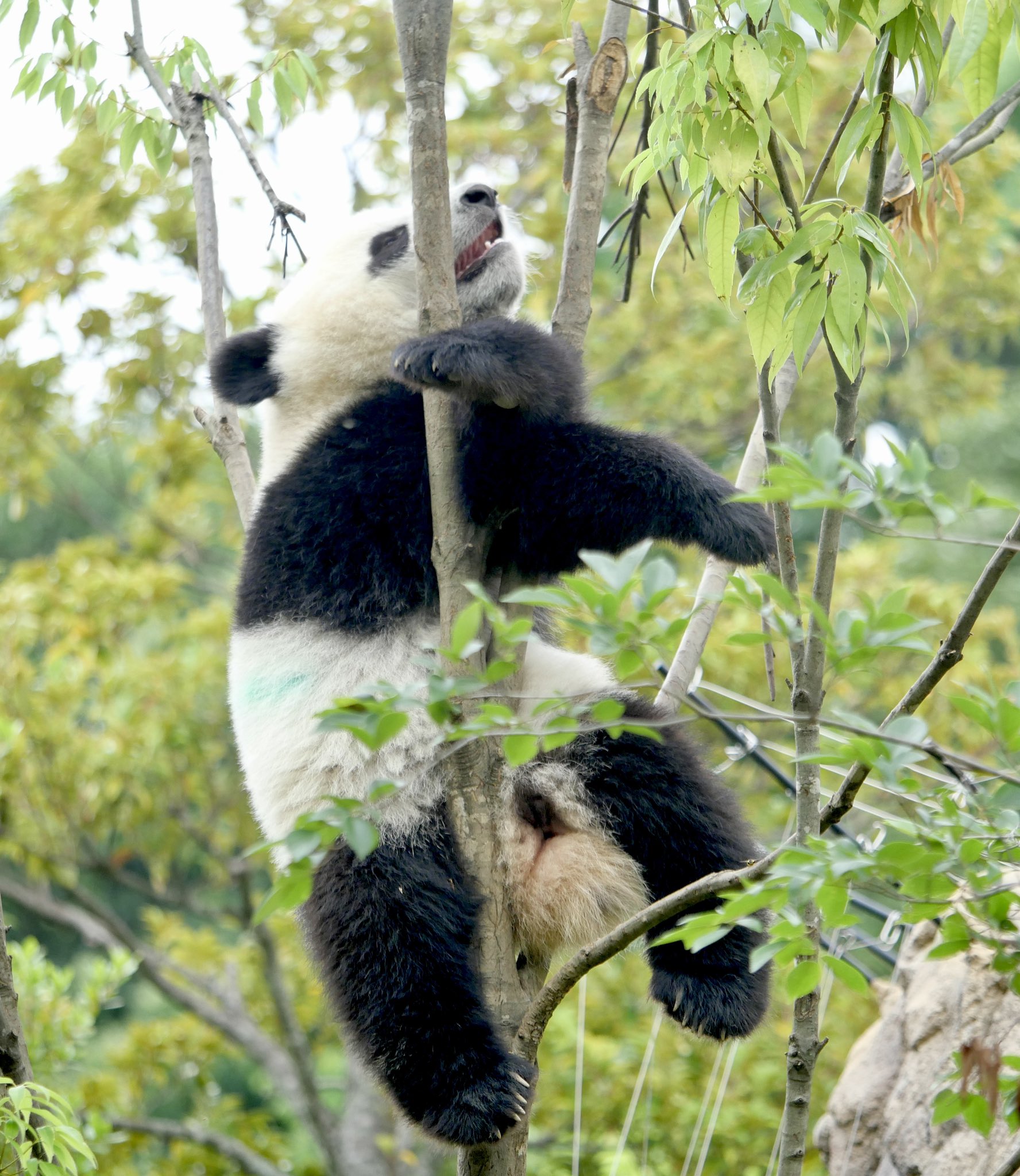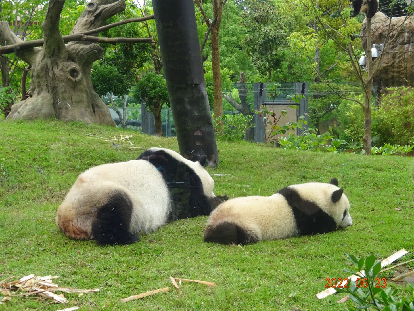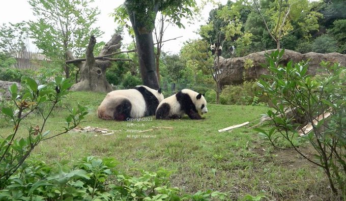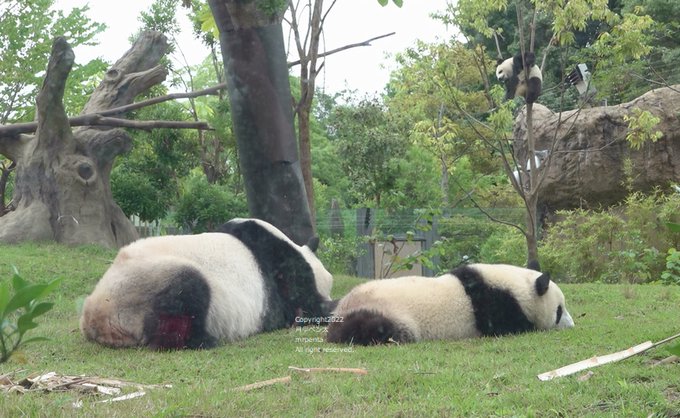 #シャオシャオ は木の子。「こちらが本日一歳になった #レイレイ です。」#シンシン は芝生をモグモグ。#レイレイ は木の実でお尻が赤くなっていました。(20220623)