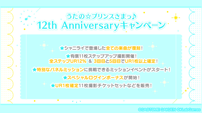 【NEWS 1/6】本日で「うたの☆プリンスさまっ♪」は12周年を迎えます!アニバーサリーを祝して「うたの☆プリンスさまっ♪ Shining Live」では様々なキャンペーンを実施します♪ #utapri_12th_anniversary #シャニライ pic.twitter.com/TaTsgl9Zff