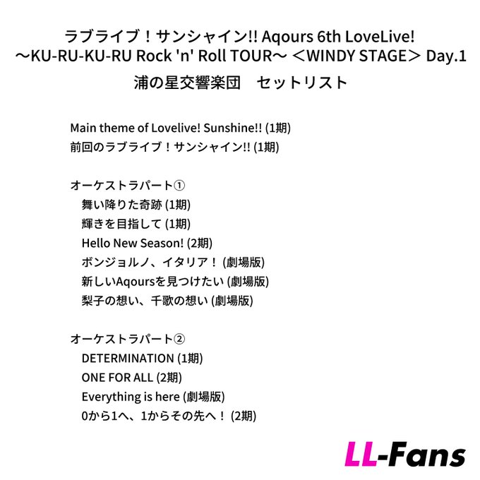 Aqours「"オーケストラ生演奏楽曲リクエスト投票"ですが、1位と2位がほぼ同数だったため、Day.1とDay.2でそれぞれの曲を披露することになりました🎶」