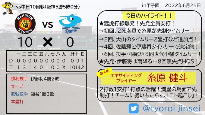猛虎打線大爆発!先発全員安打の14安打10得点で圧勝や!伊藤将は投攻守で活躍!9安打浴びてもホーム踏ませへんかったで!この勢いで3タテいきまっせー!
