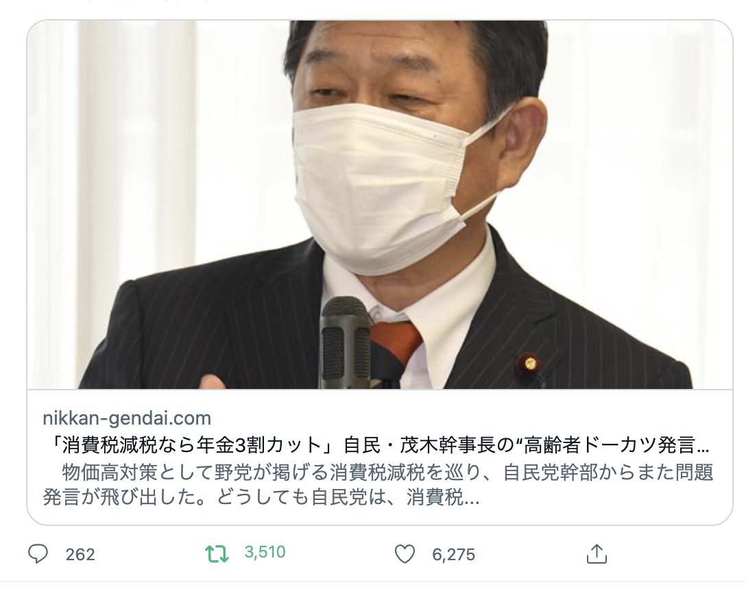 「消費税減税なら年金3割カット」自民・茂木幹事長の“高齢者ドーカツ発言”に批判殺到(日刊ゲンダイDIGITAL)