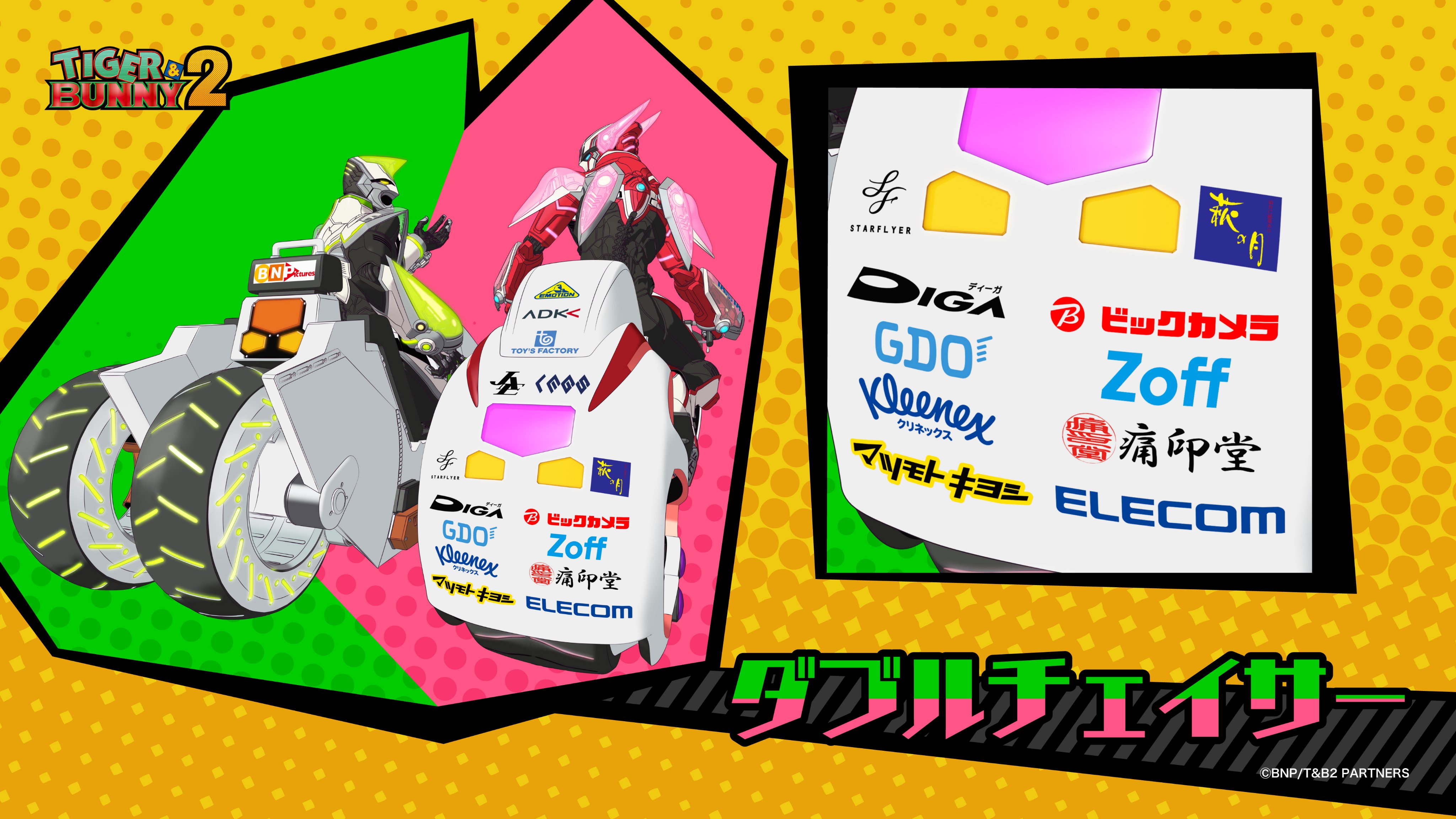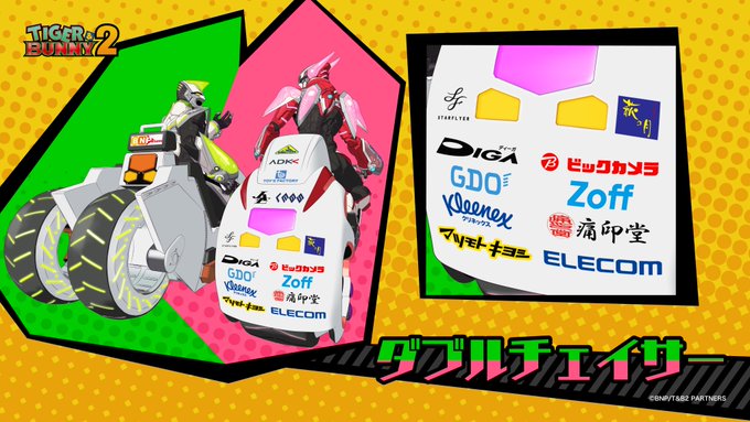『TIGER & BUNNY 2』パート2でも、ワイルドタイガーとバーナビーが乗る「ダブルチェイサー」にロゴ掲載をしてヒーロー活動を応援していきマウス🖱