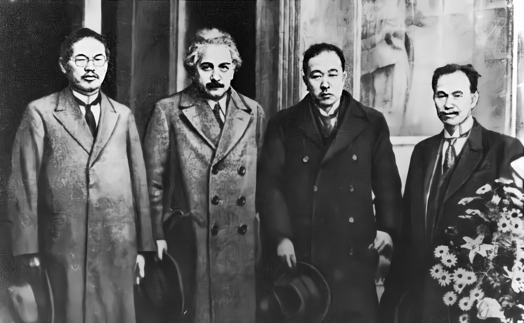 1922年(大正11)12月3日から4日にかけて #アインシュタイン は仙台と松島を訪れました。左から東北帝国大学理科大学教授の #本多光太郎、アインシュタイン、同じく #愛知敬一、#日下部四郎太。物理学の錚々たる顔ぶれです。このときアインシュタインは43歳、愛知は42歳、日下部は48歳でした。 pic.twitter.com/GzWwV9qHuY
