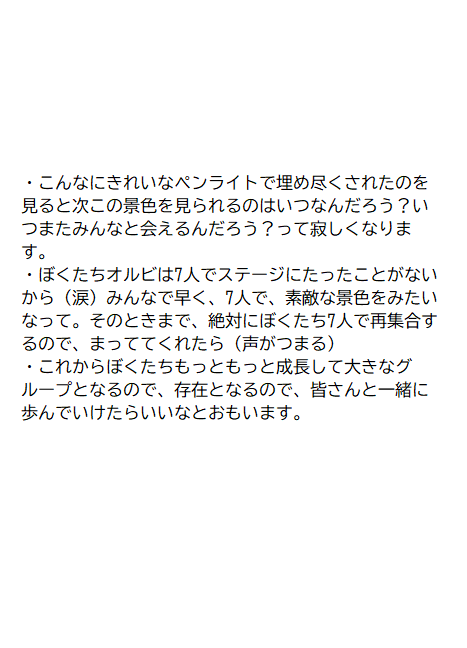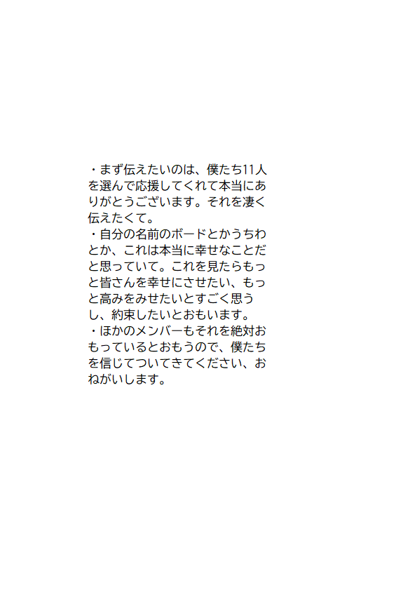 「ぼくたち11人を選んで応援してくれてありがとう。自分の名前のボードを作ってくれたりすごく幸せで、それを見るともっとみんなを幸せにしたいと思うし高みを目指したいし、それを約束する。僕たちを信じてついてきてください。」