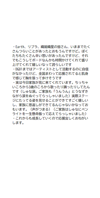メモはここまでしか残っておりませんでした(精魂尽き果てて寝落ちしてた)上原潤は漢で、これからの活動を引っ張っていく覚悟を感じました。短くてわかりやすい言葉ではっきりしっかり語ってくれていました。あんたまじすげえな、潤。