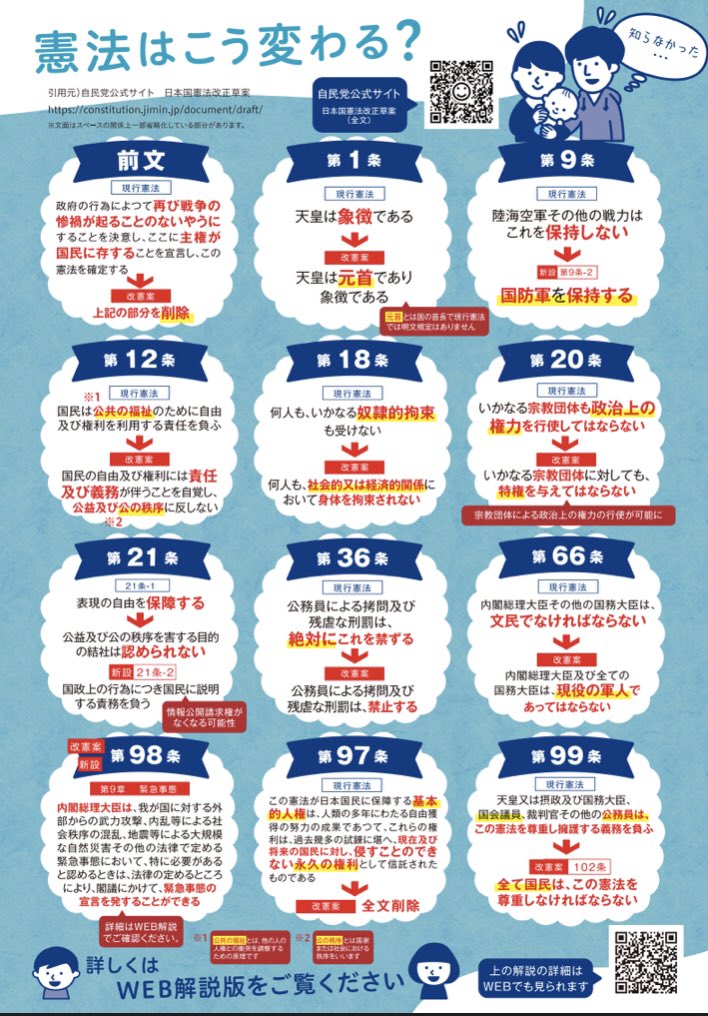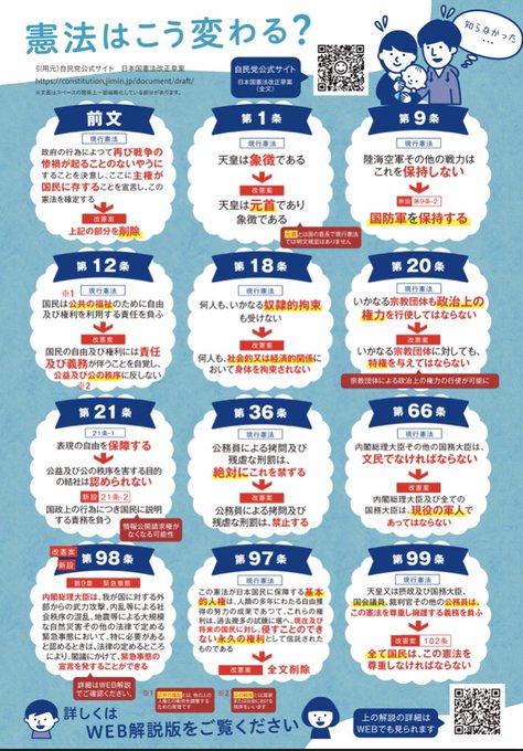 自民党主導で改憲が行われたら日本国憲法はこんな憲法になります↓