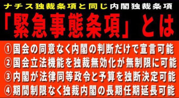 民主国家をあっという間に独裁国家に変えてしまえる破壊的なパワーを持つ緊急事態条項が入っています。