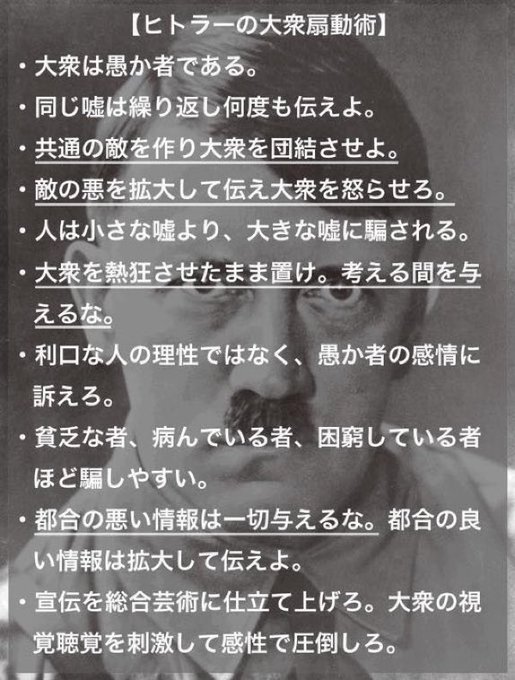 この【ヒトラーの大衆扇動術】ってのが #改憲したら戦前ですよ ってタグのタコ踊りに全て当てはまっていて、草も生えねぇ。 twitter.com/masirito22/sta…