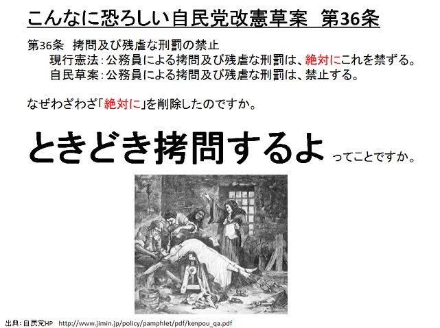 拷問を必ずしも禁止しないという事であり、自民党は改憲したら行政が立法権を得る緊急事態条項とセットで恐怖政治を行うつもりか。