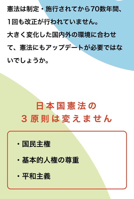 『(内閣に独裁権を与える)緊急事態条項』を『改憲4項目』に含めておいて、よくぞ『日本国憲法の三原則は変えません』などという『大嘘』を公表できるものだ。自民党が主権者である国民をとことん馬鹿にしている証左。有権者の方々、もうこれ以上、騙されてはいけません。 pic.twitter.com/3Nbcqipi7L