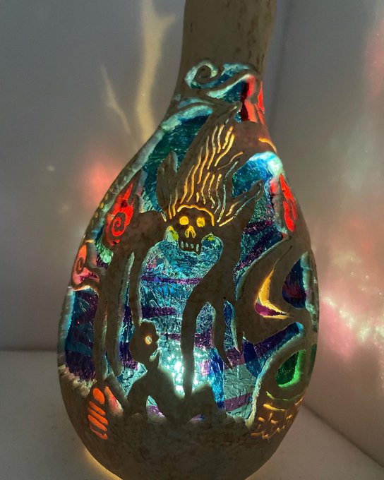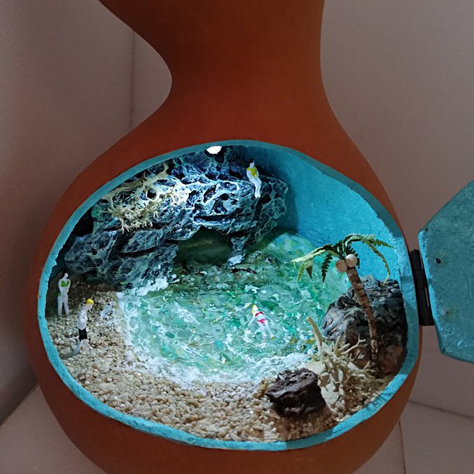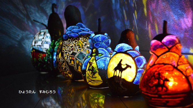 ひょうたんを加工して、ステンドグラス風ひょうたんランプや、ひょうたんの中に不思議な小さな世界を閉じ込めたジオラマひょうたん等を作製しています(^^)/