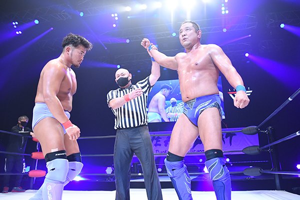 一進一退の展開の末、最後はトーチャーツールからのショックアローで、SHOがT-Hawkから3カウントを強奪!!