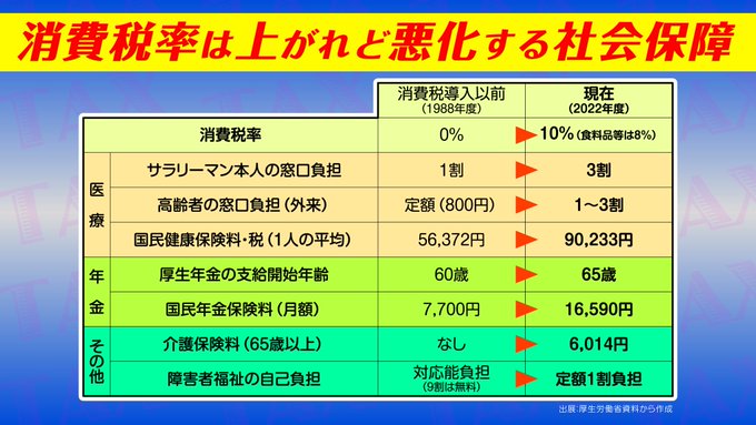 #消費税が社会保障の安定財源は国のデマ です。その証拠に消費税が導入されてから社会保障は軒並み改悪されています。 pic.twitter.com/qSoHF95Hf9