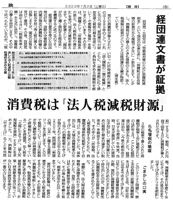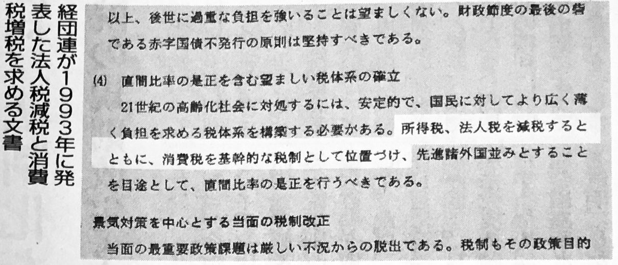 自民党は「消費税が法人税減税の穴埋めというのはデマ」と言ってるけど、経団連の文書に「法人税、所得税を減税すると共に、消費税を基幹的な税制として位置付け」と書いてあるんだよね。