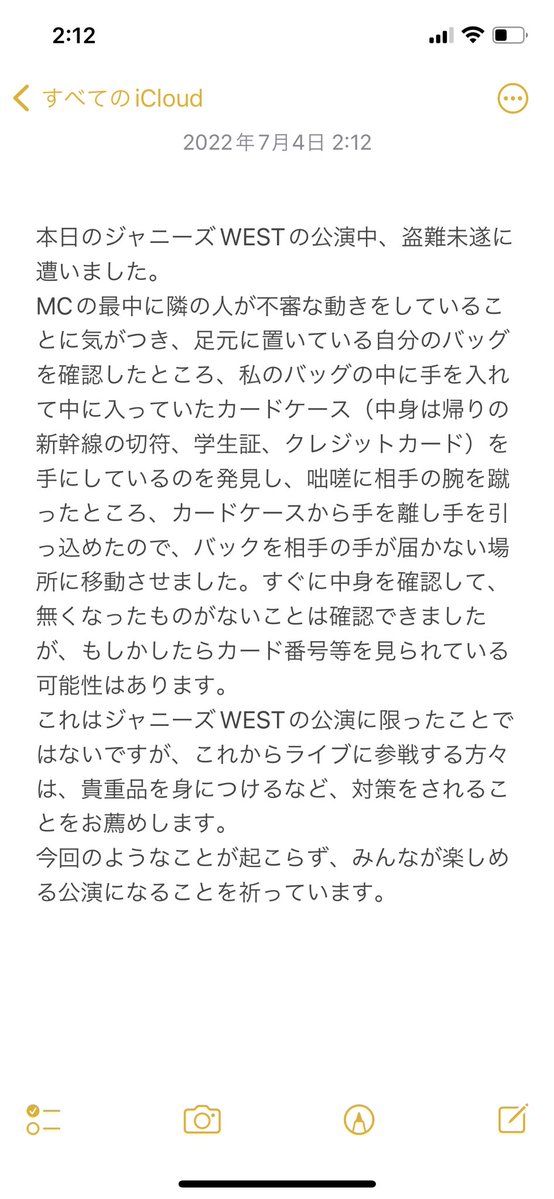7/3 (日) ジャニーズWESTの京セラ公演にて窃盗未遂に遭いました。