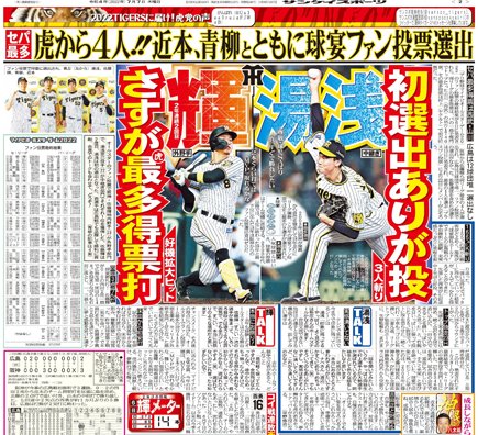 #阪神 #近本光司 選手の球団記録 #30試合連続安打 達成を、1面最終面見開きで大展開! #オールスター でファン選出された頼れる男が躍動し、チームは3連勝です。本日の大阪サンスポに掲載されています。