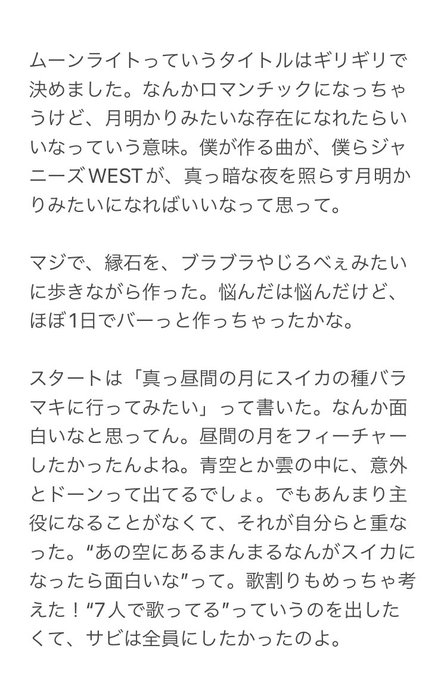 (^ワ^=)「僕が作る曲が、僕らジャニーズWESTが、真っ暗な夜を照らす月明かりみたいになればいいなって。」(TV誌より)