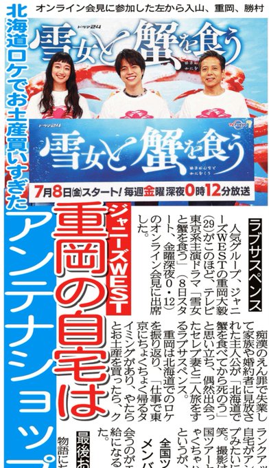 #ジャニーズWEST #重岡大毅 がテレ東系主演ドラマ「#雪女と蟹を食う」のオンライン会見に出席。重岡は北海道でのロケを振り返り「仕事で東京にちょくちょく帰るタイミングがあり、やたらとお土産を買ったら、クランクアップした頃に自宅がアンテナショップみたいになった」と苦笑。