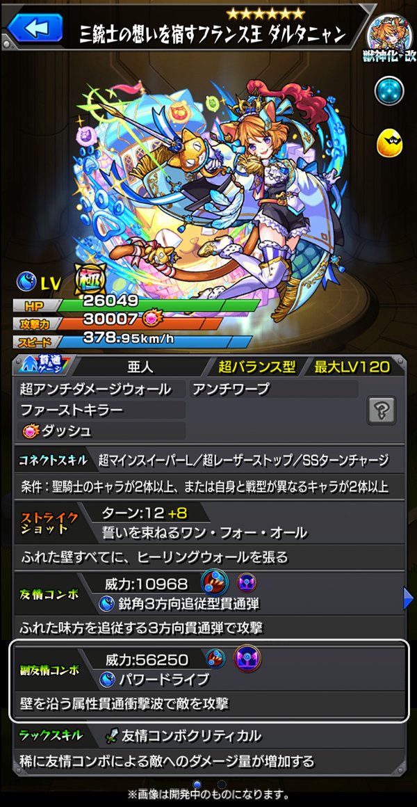 獣神化・改「ダルタニャン」!新友情コンボの鋭角3方向追従型貫通弾と、パワードライブという超強力な友情コンボセットを所持!ダメージウォール、ワープ、地雷の3ギミックに対応し、ファーストキラーも持つため幅広い活躍が期待できる! #モンスト pic.twitter.com/GDbFIiakHS