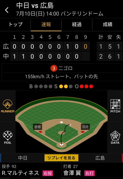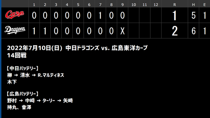 最終スコア【中日 2-1 広島】
