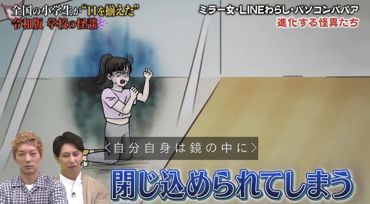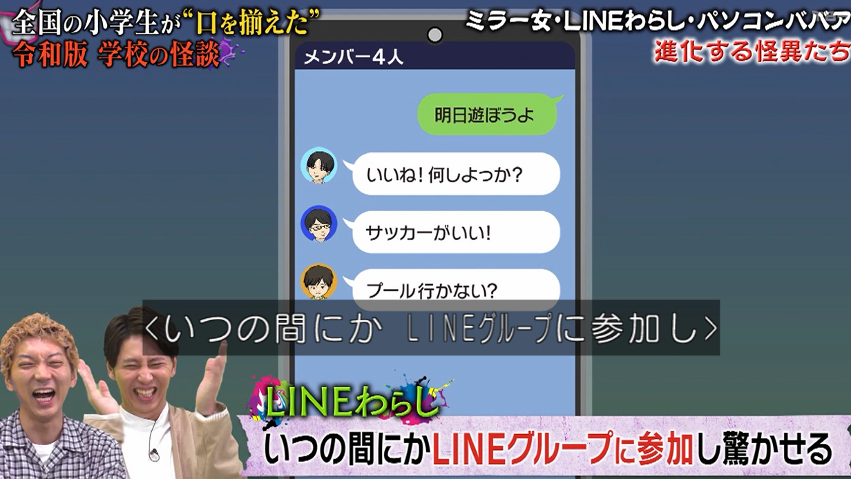 令和版学校の怪談はニノ金、ベートーヴェン、人体模型、トイレの花子さんに加えて、ダンスの教育授業追加で「ミラー女」、いつの間にかLINEグループに参加している「LINEわらし」、プログラミングの必修化で「パソコンババア」など時代に沿った新しい怪が誕生しているの面白いな