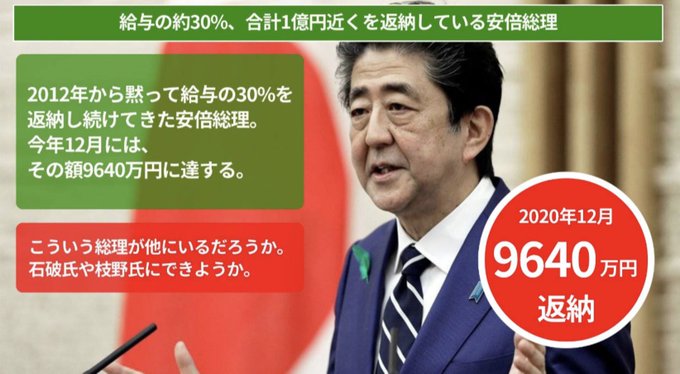 2012年から毎月給与の30%(73万円)を震災復興のため返納し続けた安倍さん。震災時の民主党政権が始め2014年までと決まっていたが、安倍さん達自民、公明、維新の三党はそれを過ぎても返納し続け、安倍さんの返納額は1億円近くに達した。最後2020年は連勤147日、休みなし