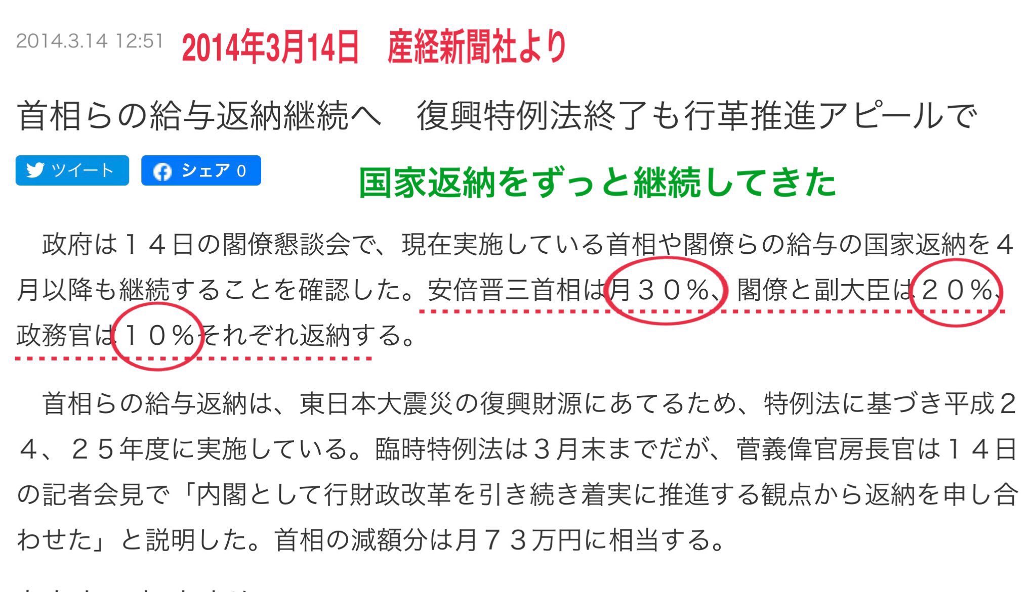 安倍さんがずっと給与の30%(約70万円)を毎月黙々と復興支援のために返納されてた事、任期中、一度も満額受け取らなかった事はどこかで報道されましたか?私の方がTVより頑張って調べてない?