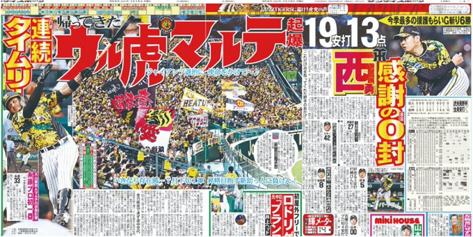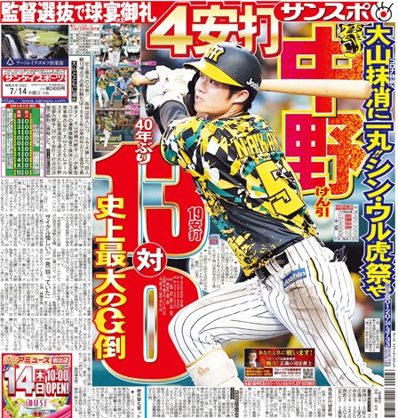 #阪神 が巨人戦13得点での零封勝ちは1982年以来2度目で最多タイです。#オールスター に監督選抜で選出された #中野拓夢 選手が4安打1打点の活躍で勝利に貢献です。本日の大阪サンスポに掲載されています。よろしくお願いします。